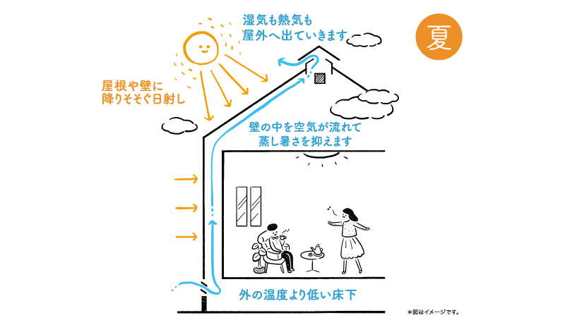 夏は壁の中を空気が流れ、こもった熱を外へ排出。