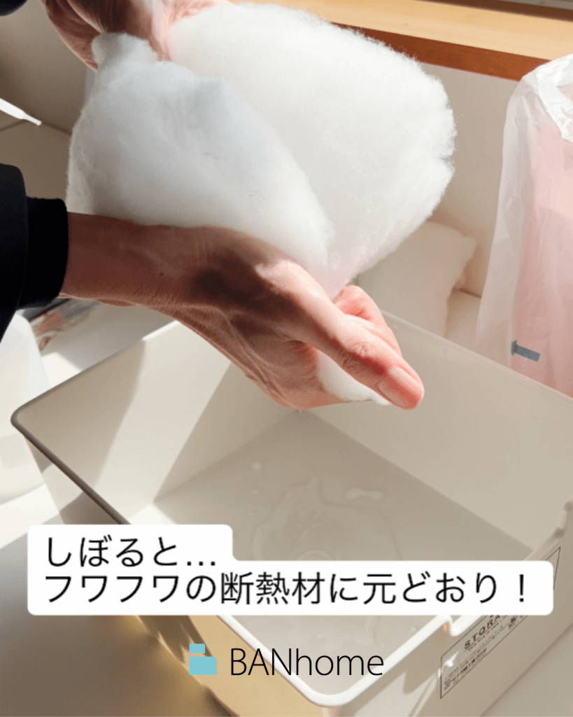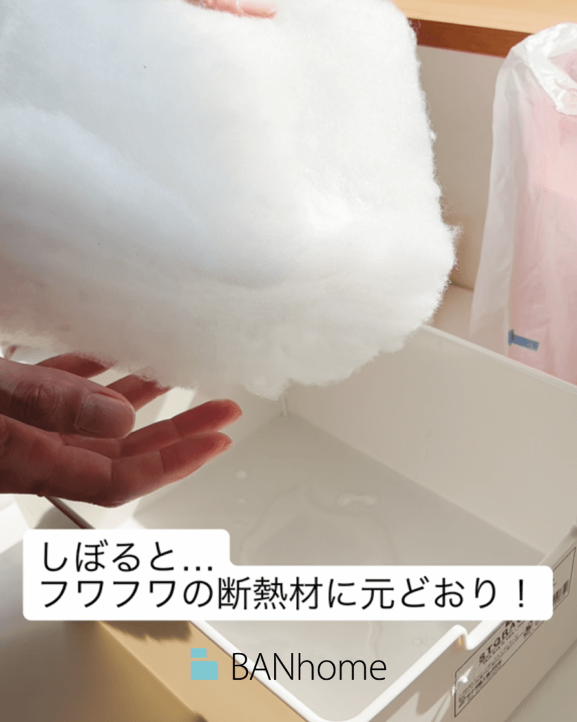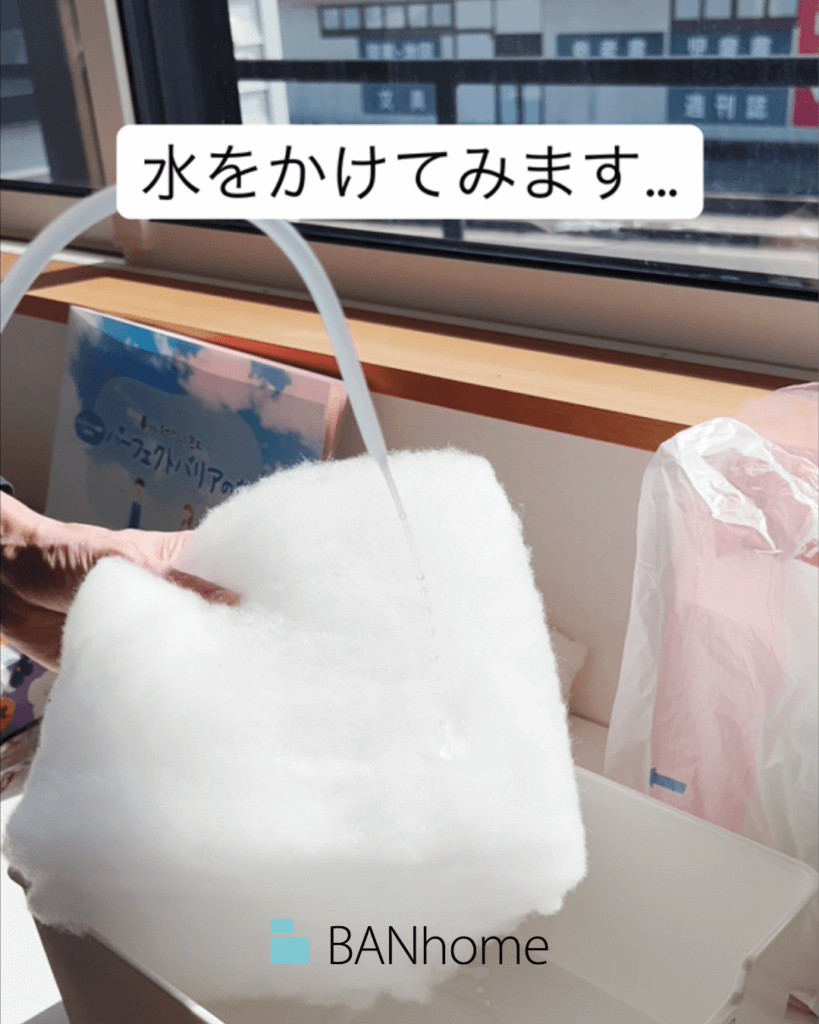 壁の中に湿気が入ったことを想定して、実際にポリエステル断熱材(パーフェクトバリア)に水をかけて実験してみました。